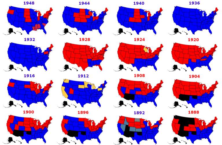 Looking over the historical results of U.S. presidential elections, I keep coming back to the same conclusion: the political landscape we’ve been living in for the past few decades is really not normal.The last time a third party won an electoral vote was in 1968. For the almost 200 years prior to that, 3-way elections occurred regularly, about once every five election cycles.Here are the election maps laid out side-by-side. Notice how close the last six elections have been by historical standards. Hard to imagine how any candidate today could flip enough voters from the other party to have a victory like Reagan in 1984.